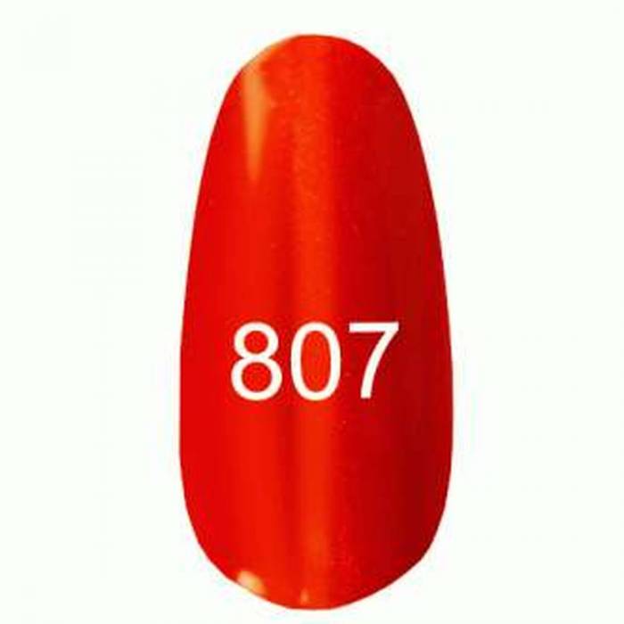 Гель-лак № 807 має розкішний червоний колір з насиченим помаранчевим переливом, який особливо яскраво і соковито виглядає в перламутровій текстурі покриття.