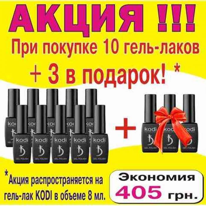 Акція! Економія – 405 грн. Додайте цей товар до кошика та при оформленні замовлення в «Коментарях» вкажіть номери бажаних 13 гель лаків. В акції беруть участь лише гель-лаки KODI Professional 8 мл класичної серії (вітражні, термо, котяче око, дзеркальні в акції не беруть участь). Інші скидки на акційний товар не поширюються!